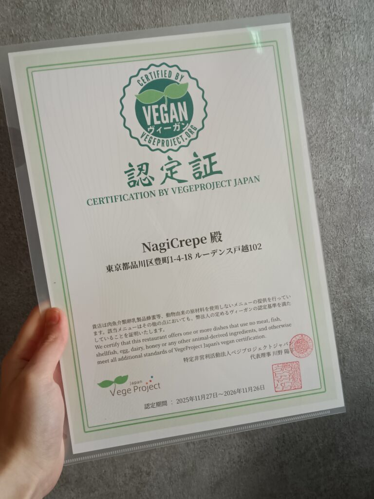 この度、ベジプロジェクトジャパン様のヴィーガン認証を、当店のクレープで取得いたしました。